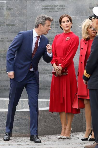 | (R-L) Crown Princess Mary of Denmark and French First Lady Brigitte Macron both opt for scarlet as they take part in a wreath-laying ceremony at the monument for fallen soldiers at the Citadel in Copenhagen, Denmark on August 28, 2018. |